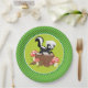 This birthday party plate features a cute clipart black and white skunk sitting on a tree stump surrounded by three red and white mushrooms. The background of the plate is green in the centre with coordinating two-tone green stripes on the rim of the party plate.