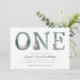 Stylish, whimsical and unique first birthday invitations featuring watercolor letters with watercolor trees and woodland animals. Personalise by adding your party details in the text template fields provided. The reverse side of the invitations feature a matching grey watercolor background.