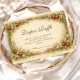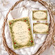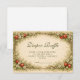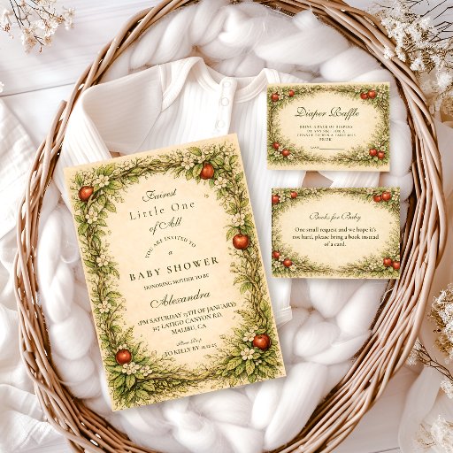 This charming baby shower design features an illustrated woodland storybook frame with twisting branches, delicate blossoms, soft greenery, and a whimsical red apple accent set against a warm parchment background. The vintage-inspired artwork and gentle earthy tones create a cozy, magical aesthetic that feels timeless and inviting, perfect for a storybook-themed celebration with a natural, fairytale-like charm.