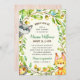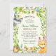 A charming woodland themed baby shower invitation. This gender neutral baby shower invite features adorable hand-illustrated forest animals, including a sweet little fox, a smiling racoon, two singing birds, and even a cute tiny hedgehog. A wreath of lush forest foliage frames the baby shower details. Easily personalise with your shower information.