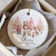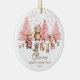 Simply perfect Baby's First Christmas ornament featuring a sweet watercolor baby forest scene with cute little woodland animals dressed in pink hats and scarfs. Flip over to the back to add your photo,
