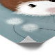 A digital painting of a whimsical furry white and brown bunny rabbit is seen against the blue wood-grained background. Some fluffy white dandelion weeds are seen on either side of the bunny. Beautiful painting in soft colours is perfect for any woodland themed area, whether it be a baby nursery, daycare facility, or playroom. Original design by Christie Black of Creations from the Heart.