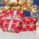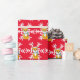 Cute hand drawn cartoon fox in Santa hat with a snowflake and red background Christmas wrap.