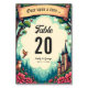 This elegant fairytale-style wedding table number is perfect for a modern wedding. The retro design features a vintage enchanted forest, a castle illustration, and black calligraphy on a storybook-themed background.
