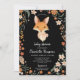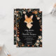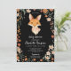 An adorable vibrant watercolor woodland fox with orange green boho floral frame baby shower invitation on a black background.
