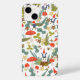 Whimsical green and red woodland themed pattern designed by Shelby Allison featuring tiny gnome characters, mushrooms, flowers and foliage.
