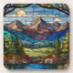 A radiant stained glass scene of a majestic forest sanctuary, where towering trees frame a stunning mountain range in the distance. Light and color intertwine to create a serene yet powerful tribute to the wild.