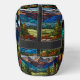 A radiant stained glass scene of a majestic forest sanctuary, where towering trees frame a stunning mountain range in the distance. Light and color intertwine to create a serene yet powerful tribute to the wild.