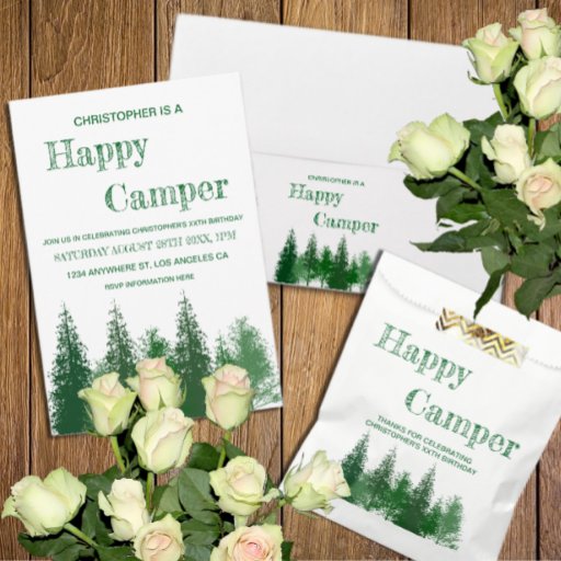 Happy camper birthday with woodland trees in various shades of green