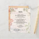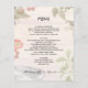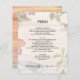A wedding menu template with images from nature. Boho / bohemian wedding theme is the design for this custom menu. Leaves, flowers, feathers, berries and a bird make up the border over a light, wood board background. Uppercase, printed text is easy to personalise with the menu appetizers, main course, or buffet, and desserts. Put the names of the newlywed couple and wedding date at the bottom. Reverse has a wood boards image.