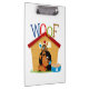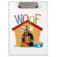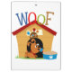 A cute dog with a ball and dish of food, a dog house, and colourful text that reads WOOF on Woof Dog T-shirts, hoodies, mugs, bags, cards, stickers, key chains, buttons, magnets, dry erase boards, electronic cases and sleeves, paper plates and napkins, and many other dog design items!
