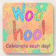 Have fun entertaining with these fun and whimsy WooHoo coasters. The customizable words Celebrate Each Day under the WooHoo word text image can be changed to your own words or personalize with a name. The colorful graphic art background with the words WooHoo in text art is personalized with your name. The words WooHoo are on an orange and lime green ombre background. The art design background is textured with flowers and line outline flowers. Colors: Turquoise teal blue orange lime green purple.