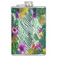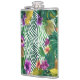 The picture shows a lively mosaic of lush Monstera leaves in lush green and yellow, combined with magnificent purple and orange flowers that stand out against a dynamic, wave-like background. It radiates a wild, tropical energy and a joyful abundance, which awakens curiosity and a natural connection.