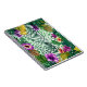 The picture shows a lively mosaic of lush Monstera leaves in lush green and yellow, combined with magnificent purple and orange flowers that stand out against a dynamic, wave-like background. It radiates a wild, tropical energy and a joyful abundance, which awakens curiosity and a natural connection.