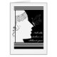 Art Deco styled greeting card of a female profile in white wearing a decorative floral headband. Words on cover: Nuk ishte dashuri ne shikim te pare "It was love at first sight". Albanian love and romance paper greeting card with black and white Art Deco inspired illustration. Lady with butterfly lighting on her nose. Art, image, and verse copyright © Shoaff Ballanger Studios.