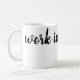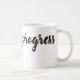 Progress over perfection—every single day. This minimalist white mug features bold black text that reads: "Work in Progress."