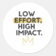 Embrace the power of working smart, not hard, with this bold and modern graphic. The motivational quote "Low Effort, High Impact" is a minimalist statement for efficiency and success. Featuring clean, bold text and a simple gold crown, it's the perfect design for entrepreneurs, leaders, and anyone who believes in achieving maximum results with focused energy.