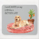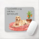 Here's the perfect mouse pad for the Labrador Retriever owner! The image is of a beautiful yellow lab resting on a cushion, with a blooming potted plant next to it. The grey text at the top says "I work HARD so my LAB has a BETTER life". Cute!