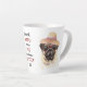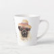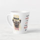 Here's the perfect latte mug for the Pug owner! At each side is a portrait of a cute Pug. One is wearing a sombrero style hat, and red sunglasses. The other is wearing a dapper man's hat, and a red and white striped bow tie. Between the images is black and red text that says "I work HARD so my PUG can have a BETTER life". Cute!