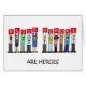 A group of cartoon people of different ethnicity standing in a row. They are holding up red square cards that have white letters on that spell out 'Blood Donors'. Under the image are the words 'Are Heroes'.