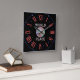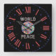 This wall clock features a collection of flag from different countries througout the world in a collage style with the words “World Peace” with matching letters in a bold print font in this peace not war style and theme with a black background. This clock is made for any wall and printed with a AcryliPrint®HD process measures 10.75" x 10.75" and made from grade-A acrylic. Battery operated uses one AA battery for Indoor use only, not recommended for outdoor use.