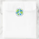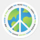 A round sticker with a stylised graphic of the globe, a symbol of our interconnectedness as a global community. Encircling the Earth, a pristine white peace sign and the word Peace in several different languages, a universal emblem of tranquillity sending a message of hope, unity, and the shared yearning for a peaceful world. An original creation by Mango Moon Studio.