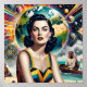 A beautiful, retro-style woman smiles among the planets and galaxies. The vivid colors, bold energy, and vintage theme pay tribute to the thrilling imagination of midcentury book covers and movie posters.