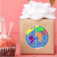 World Peace design with colourful map of continents in the background and peace symbol silhouette lines. Communicates the concept of world peace through illustration with no words. The same in every language!
