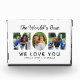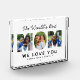 Create a stylish and memorable gift for Mum this Mother's Day or any day! This custom tabletop photo block features a collage of three favourite family pictures of the kids designed as a modern and bold sans serif typography design. Personalise the custom text with the names of the children and modify the black text, pink heart, and white background if you would like different colours to coordinate with your home decor.