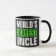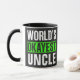World's okayest uncle. World's in uppercase white black sans font. Okayest in black uppercase font with neon green coloured surround. Uncle in white uppercase font can be customised with another word or description.
