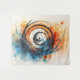 Abstract ink and watercolor painting in reds and blues on a white background of intersecting arcs representing a hole in the fabric of time-space.