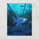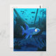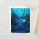 Postcard showing a somewhat worried looking cartoon shark swimming around.
