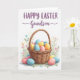 Designed with a bright springtime look, this greeting card centers on a woven light-brown basket with a curved handle, drawn with fine strand details. Inside are smooth egg shapes in pastel pink, sky blue, and butter yellow, with a few resting at the base as if gently tumbled out. A white background keeps everything airy, while slim green stems and simple blossoms in light blue, soft orange, and pale pink frame the basket like a quiet garden scene 🌷. Near the top, the text “HAPPY EASTER” sits prominently in uppercase, using a straightforward letter style in warm purple. Just below it, “Grandson” appears in a flowing letter style, also purple, with small decorative swirls that feel like an affectionate flourish 🐰. Soft shading under the basket and eggs adds depth, and the pastel eggs cluster close together in front of the basket’s lower edge. Behind the handle, a few flowers peek upward with rounded petals and thin leaves in gentle spring colors.