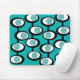 This mouse pad has a Mid-Century Modern design of lines making circles inside ovals strung together in turquoise, black, and, white.