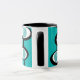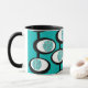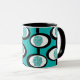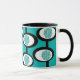 This mug has a Mid-Century Modern design of lines making circles inside ovals strung together in turquoise, black, and, white.