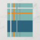 An abstract design of woven stripes in shades of blue, grey and orange.