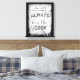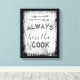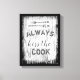 A wrapped canvas kitchen wall art has typography cute quote humour on rustic style design with kiss the cook text in grey tones and black border rustic chic style. Artwork copyright Ann Powell