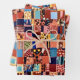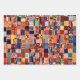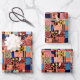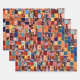This wrapping paper comes in a patchwork design filled with colorful shapes and patterns.