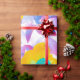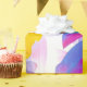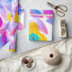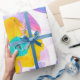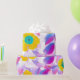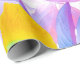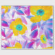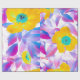 A lively floral design featuring bold yellow blossoms with turquoise centres, surrounded by pink, purple, and blue petals on a crisp white background. Perfect for wrapping paper, party supplies, or cheerful home décor.