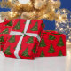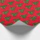 Holiday gift wrapping paper shown in a red background colour with a festive Christmas tree print.