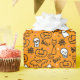 Wrapping Paper with a modern minimalist design for Halloween, a pattern of silhouettes of skulls, ghosts, cobwebs, a silhouette of a cat, pumpkins on an orange background.