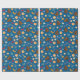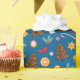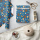 Wrapping Paper with a New Year's pattern, cute pictures of candies, lollipops and gingerbread cookies, bows and leaves on a blue background.