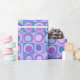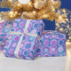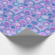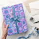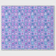 wrapping paper in repeating pattern of abstract squares and blobs, blue and lavender colour tones