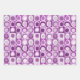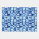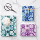 wrapping paper in repeating pattern of abstract squares and blobs in solid colours teal blue magenta