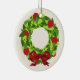 A Christmas ornament featuring an illustration of a wreath made of holly leaves decorated with red ornaments and a bow.