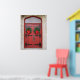 Two green wreaths, with festive red ribbons, adorn the beautiful red, gothic doors of an old stone church.