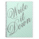 A notebook with a lovely script font for all those things you need to write down and hold on to. Shown here with an aqua and white striped background and grey font colour.