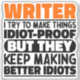 Funny Writer Sayings "Writer I Try To Make Things Idiot Proof But They Keep Making Better Idiots". Grab this Funny Writer design as a funny gifts for an awesome mum, dad or friend.