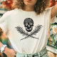 This skull-and-crossbones design for writers has quill pens instead of bones, the word "writer" etched into the skull and two tiny typewriters in the eye sockets. It's a unique and slightly scary / creepy design for anyone who enjoys writing, is a published author / novelist, a journalist, a poet, or a screenwriter. It would be especially great for someone who writes horror, mystery, Gothic, thrillers or anything else with a dark twist. Also available in white for dark shirts.