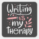 "Writing is my therapy" typography sticker in white and pink with black background.